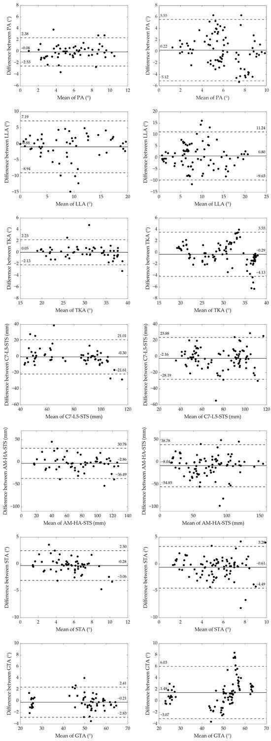 The major findings of this study demonstrate that the test–retest reliability of the measured parameters (inter-trial comparison) was excellent for TKA (ICC = 0.97), C7-L5-STS (ICC = 0.91), and GTA (ICC = 0.99); good for AM-HA-STS (ICC = 0.85); and moderate for PA (ICC = 0.57), LLA (ICC = 0.72) and STA (ICC = 0.73) (Table 3). The excellent reliability of TKA, C7-L5-STS, and GTA suggests that these measurements can be consistently reproduced, making them valuable for clinical and research applications. Although PA, LLA, and STA demonstrated moderate reliability, their reproducibility remains sufficient for research purposes. Overall, the observed levels of reliability confirm that the method provides consistent results and can be effectively utilized in future studies.