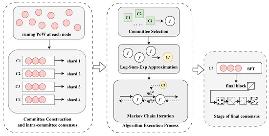 The algorithm framework is shown in Figure 1. The first part is the construction of committees before the algorithm implementation and the two-stage latency of the committees. In this part, committees are formed through a proof-of-work-based election mechanism, which causes the committee formation latency. This is followed by the internal consensus phase within the committee, known as consensus latency. Then, committees are selected as feasible solutions. To make the problem clearer and solvable, we use Log-Sum-Exp approximation (see Section 3.2) to simplify the problem. Next, using the iterative optimization idea based on the Markov chain (see Section 3.3), feasible solutions are continuously iterated and optimized to select the optimal solution based on the transition probability matrix. The specific process of the algorithm (see Section 3.4) includes the algorithm flow and the derivation of the algorithm’s convergence. Finally, the best committee combination selected is submitted to the final committee, forming the final block.