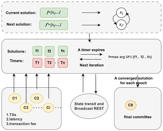 During each iteration, the algorithm randomly selects two committees i and from the current state, setting and , respectively. It calculates the current system utility and the hypothetical utility , then uses these values to generate a timer for continuous monitoring. Figure 4 shows the execution process of the algorithm, where the algorithm runs on multiple independent parallel threads. Each thread executes a set of feasible solutions and timers . All parallel threads communicate with the committees in real time, exchanging a limited set of messages such as reset signals and the current system utility.