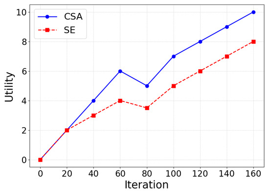 First, the committee scheduling algorithm (SE) and our CSA are compared with a smaller number of iterations. The SE algorithm determines the optimal committee set of the blockchain through iterative optimization, which is one of the best performing algorithms in the field of committee scheduling. As shown in Figure 6, it can be seen that during this iteration, the CSA iterative process is generally similar to that of the SE. However, due to the inclusion of the transaction fee metric in the CSA, the utility of the committees demonstrated by the proposed algorithm is slightly higher. Additionally, CSA is able to converge quickly to the maximum value in a shorter time, reflecting better scheduling performance.