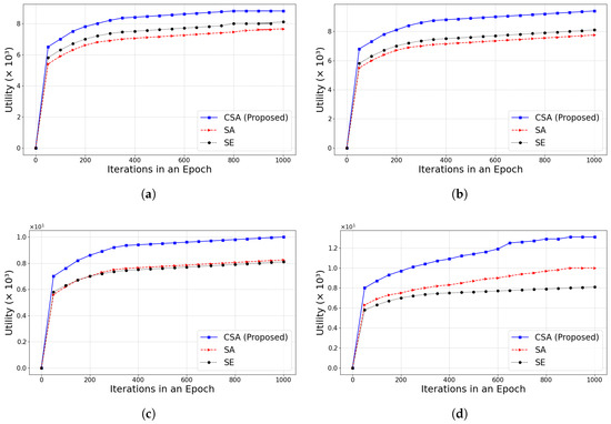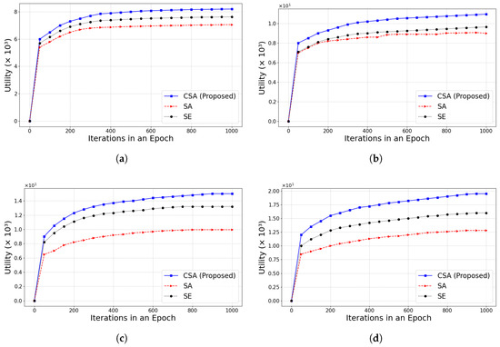 Next, the CSA is compared with the SE and simulated annealing optimization algorithm (SA) when the number of iterations is larger. SA [39] is a classical heuristic algorithm that mimics the metal annealing process to search for the global optimal solution. As shown in Figure 7, the experimental results are demonstrated for different values of under the condition of = 0.1. The value represents the impact of the transaction number weight on the utility value. The utility value increases rapidly at the beginning of the algorithm execution and converges to a higher level after about 100 iterations. As the iterations proceed, the utility value of the system gradually converges to the optimal level. The experimental results show that the utility value gradually increases as increases. Once exceeds 0.5, the gap in utility between the scheduling algorithm and other optimization algorithms gradually widens, but the growth rate becomes slower. CSA has obvious advantages in both convergence speed and final utility.