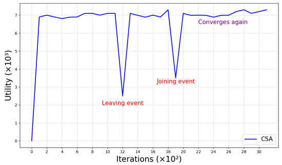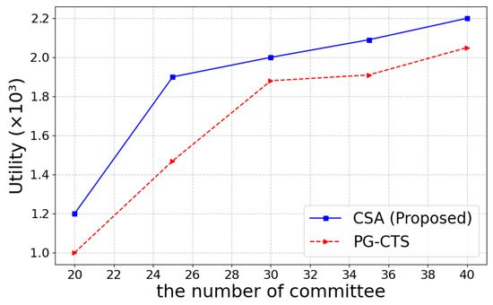 In addition, we compare CSA to the Policy Gradient Computing Task Scheduling Optimization Algorithm (PG-CTS) [39] based on deep reinforcement learning. Figure 9 shows the final utility values of the two algorithms for different committee number. The comparison results indicate that both the proposed algorithm and PG-CTS show an increasing trend as the committee number increases. When the committee number exceeds 25, the gap between the two gradually widens, with the CSA algorithm showing more significant advantages. Therefore, it can be concluded that CSA has better scalability in large-scale systems compared to the PG-CTS.