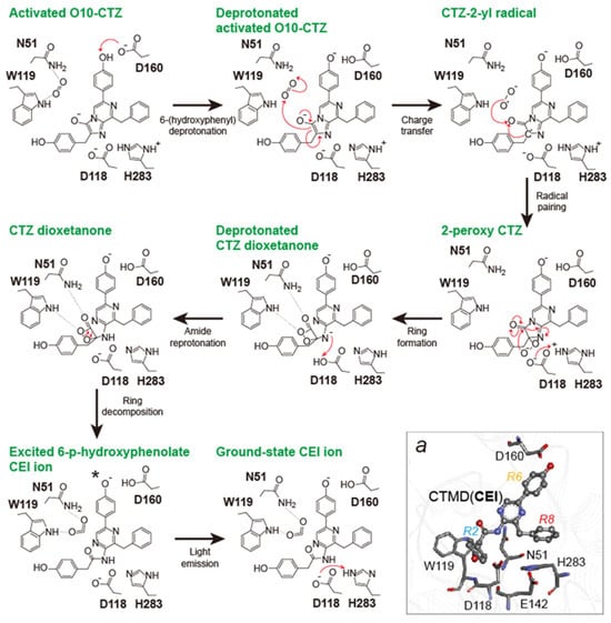 - Shimomura, O.; Teranishi, K. Light-emitters involved in the luminescence of coelenterazine. Luminescence 2000, 15, 51–58. [Google Scholar] [CrossRef]