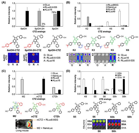- Kim, S.-B.; Kamiya, G.; Furuta, T.; Kitada, N.; Maki, S.A. Coelenterazine Indicators for the Specific Imaging of Human and Bovine Serum Albumins. Sensors 2023, 23, 6020. [Google Scholar] [CrossRef]