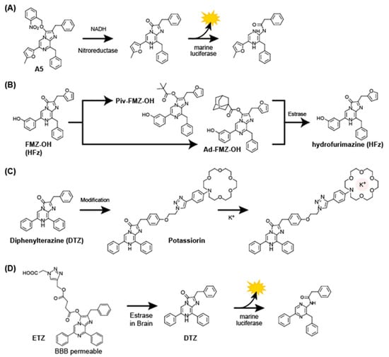- Nishihara, R.; Abe, M.; Nishiyama, S.; Citterio, D.; Suzuki, K.; Kim, S.B. Luciferase-Specific Coelenterazine Analogues for Optical Contamination-Free Bioassays. Sci. Rep. 2017, 7, 908. [Google Scholar] [CrossRef] [PubMed]