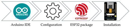 The Arduino IDE provides a user-friendly graphical environment that simplifies development, making it convenient to use. The installation process for the ESP32 in the Arduino IDE is outlined in Figure 1. After downloading and installing the IDE from the official website, users can configure necessary settings, such as Preferences and Additional Boards Manager URLs. These configurations enable support for various hardware platforms, allowing the IDE to be customized for different projects. Next, the ESP32 package by Espressif Systems can be found and installed through the Boards Manager. Once installed, the AI Thinker ESP32-CAM can be selected from the Board menu under Tools to ensure proper configuration for uploading and communicating with the ESP32-CAM hardware. Figure 2 shows the ESP32-CAM module used in this paper for implementing edge computing.