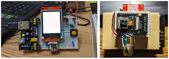 The system architecture is designed to enable efficient real-time object detection on a single-chip ESP32 microprocessor (TaiwanSensor, Tainan, Taiwan). The ESP32-CAM is a low-cost, compact development board that combines the ESP32 microcontroller with an onboard camera module, making it suitable for IoT applications involving image and video capture. It features a built-in OV2640 camera (TaiwanSensor, Tainan, Taiwan) module that supports image resolutions of up to 1600 × 1200 pixels, which contributes to its popularity in cost-effective edge computing solutions. In this study, the ESP32-CAM was utilized to capture images with its onboard camera. After capturing the images, the visuals were displayed on a 1.8-inch 128 × 160 TFT-LCD ST7735S (TaiwanSensor, Tainan, Taiwan), while image recognition was performed simultaneously. The recognition results were output to the TFT-LCD ST7735S, and the detailed image data were transmitted via UART to the Arduino IDE [].