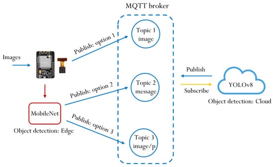 This study employs the MQTT protocol for communication with the cloud server. The edge device, ESP32-CAM, publishes images or recognition results, which are sent to the cloud laptop via the MQTT broker. Upon receiving the message, the laptop publishes the results back to the ESP32-CAM. Both the edge device and the cloud server function as publishers and subscribers, as illustrated in Figure 3.
