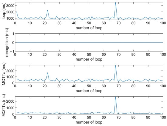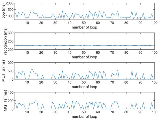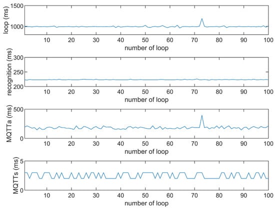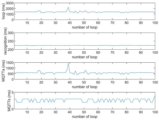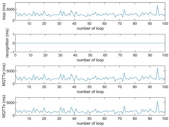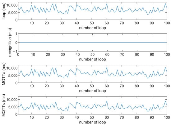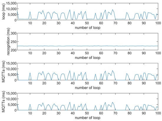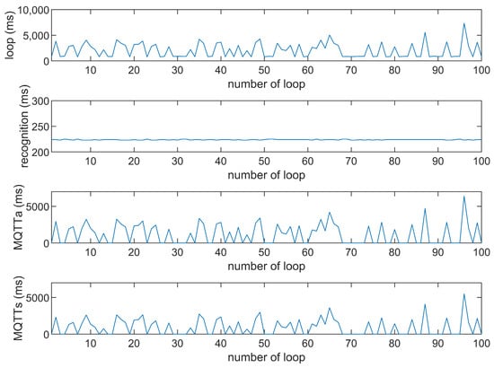 This study compares the average execution times of three options, Option 1: “send image for all”, Option 2: “send message for all”, and Option 3: “send image when person detected”. The comparison is made across three MQTT brokers at different distances: cloud laptop local, domestic MQTTGO, and international Eclipse. Each option is tested over 100 iterations. As shown in Table 1 and Figure 11, Figure 12, Figure 13, Figure 14, Figure 15, Figure 16, Figure 17, Figure 18 and Figure 19, the experimental data reveal that, when sending images (640 × 480 JPEG files) to a domestic broker, the average time per full iteration is 1655 ms longer (2.58 times) compared to sending to a local MQTT broker sharing a Wi-Fi hotspot. When connecting to an international broker, the average time increases by 5815 ms (6.55 times). These data illustrate the impact of network latency, which varies with the distance to the server. When network latency is significant, reducing the size of transmitted data can effectively minimize their impact. For example, the total time to send messages to the Eclipse server is only 20.34% of the time required to send images, indicating that reducing the amount of transmitted data can effectively mitigate the effects of latency.