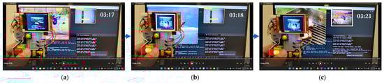 Figure 21 illustrates the sequential results in the proposed edge–cloud object detection system. In each diagram of Figure 20, the timestamp is displayed in the top-right corner. At 03:17, a person is detected within the monitored area. The ESP32-CAM captures an image, processes it for recognition, and updates the result on the TFT-LCD, all within less than 1 s. Then, it takes approximately 5 s for the cloud to receive the image, perform recognition, and send the results back to the edge device. Experimental results show that, when connected to a domestic broker and using Option 3, “sending images only when a person is detected”, the timing diagram demonstrates that pre-processing enhances real-time performance, as reflected in the timing sequence from the video.