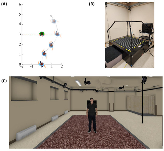 The layout of the obstacle circumvention task from a bird’s eye view with the interferer standing at 3 m from the start position (A). Photograph of the Infinadeck (B). Virtual environment depicting a condition with the interferer standing at 3m from the start position (C).