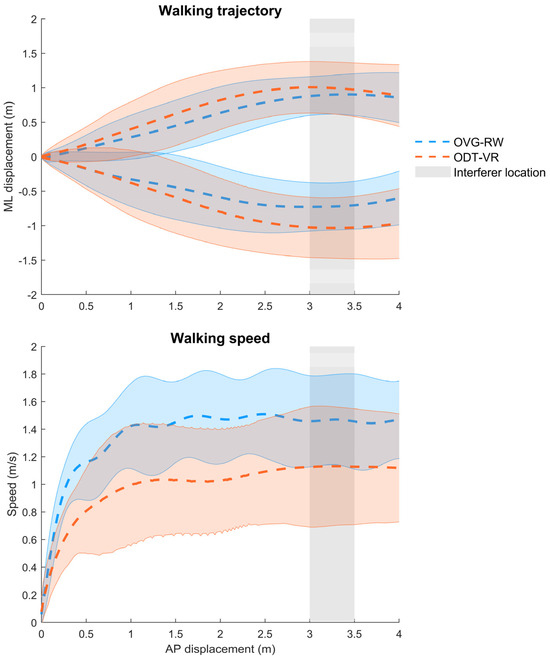 Mean ± 2SD Traces representing walking trajectories (Top) and walking speed (Bottom) from all participants in both the OVG-RW (Blue) and ODT-VR (Orange) conditions. Shaded gray area marks the positions where the interferer would be standing (3.0 or 3.5 m).