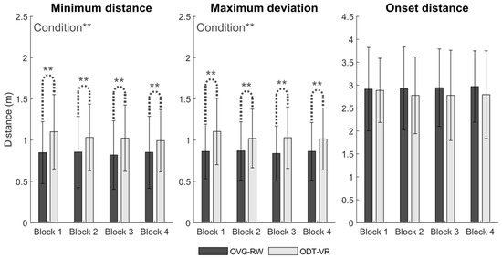 Figure 2 depicts participants’ trajectories and walking speed profiles in the ODT-VR and OVG-RW conditions, while trajectory adaptation outcomes are displayed in Figure 3. Statistical analyses revealed that minimum distance (X2 (1, 476) = 7.96, p < 0.01) and maximum deviation (X2 (1, 476) = 9.38, p < 0.01) were significantly larger in the ODT-VR condition, reaching a difference of 0.19 and 0.18 m, respectively. A trend toward smaller onset distances (i.e., 0.13 m) in the ODT-VR condition was observed but it did not reach statistical significance (X2 (1, 476) = 3.80, p = 0.05). Percentages of right circumventions in the OVG-RW (62.7%) and the OVG-VR (65%) conditions were qualitatively similar. As for the effect of block (i.e., repeated practice) or the interaction between condition and block, no statistically significant differences were observed for minimum distance, maximum deviation, or onset distance.