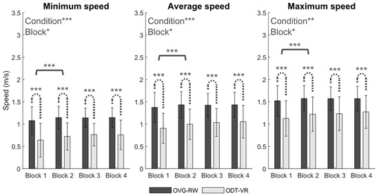 Concerning walking speed adaptations, a significant effect of condition was observed for minimum (X2(1, 476) = 13.38, p < 0.001), average (X2(1, 476) = 12.25, p < 0.001), and maximum (X2(1, 476) = 10.63, p < 0.001) walking speeds. Respectively, walking speeds were 0.40, 0.41, and 0.34 m/s slower in the ODT-VR condition (Figure 4). A similar decrease was observed in the ODT-VR condition for unobstructed trials (Δ = 0.41 m/s).