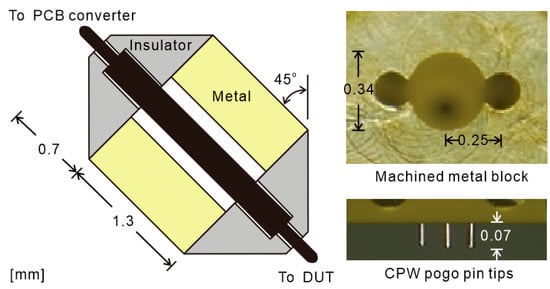 Figure 2. The internal structure of the metal block is constructed in the form of a coaxial line. To form a 50 Ω coaxial line impedance, the diameter of the signal pin barrel and the metal block hole are selected to be 0.15 mm and 0.34 mm, respectively. The metal block also serves as a shielding structure for the pogo pin ensuring low-loss signal transmission. The diameter of the ground pin and metal block hole is the same as to provide fine ground connection. The pogo pin tips are placed in a linear G-S-G arrangement of 250 μm, shown in