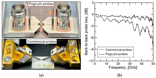 Figure 3a is a photograph of contacting the through pattern with the pogo pin probe and commercial probe (ACP40-A-GSG-150, Formfactor, Inc., Livermore, CA, USA) to measure the insertion loss performance of the pogo pin probe. Commercial probe measurements are also performed under the same conditions for performance comparison. To check the characteristics of the probe itself, subminiature version A (SMA) calibration is performed. This calibration uses the 2.4 mm 85056D calibration kit to calculate the value up to the reference plane of the probe connector. The result of measuring the back-to-back through line after SMA calibration is shown in