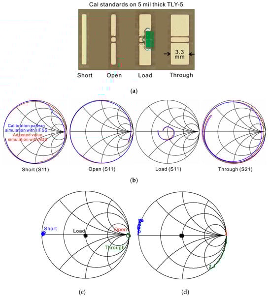 Figure 4a shows the calibration standard pattern for the pogo pin probe calibration. It is designed in low-loss TLY-5 PCB substrates (dielectric constant 2.2) providing low material loss properties up to 50 GHz. Short, open, load, and through patterns capable of SOLT calibration are designed. The calibration standard pattern resembles commercial products. Unlike the typical calibration standard, the load pattern is designed with a nonplanar surface by soldering chip resistance (green blocks in