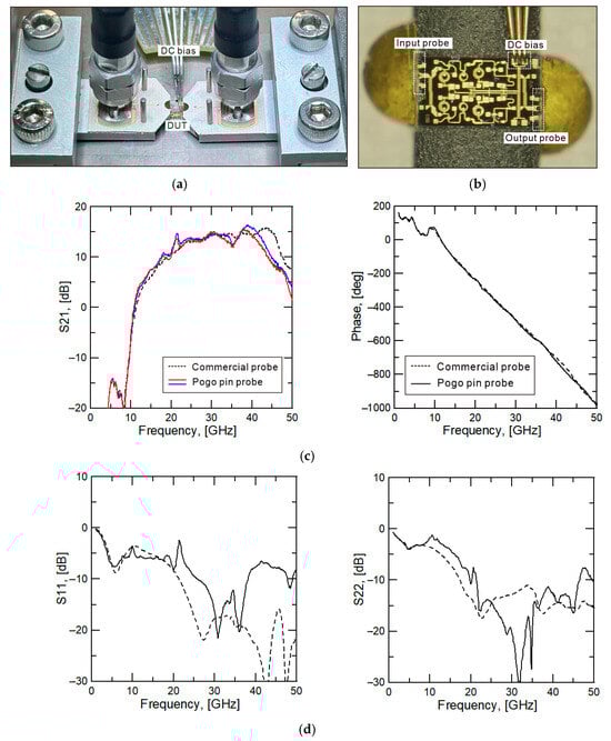 Figure 5c shows the S21 performance of the amplifier chip measured by the commercial RF probe and pogo pin probe. The solid line represents the pogo pin probe card results, and the dashed line corresponds to the commercial probe measurements. Overall, the S21 magnitude results in