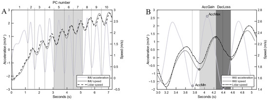 The RMSe between the IMU-based and Lidar-based velocity curves was 0.16 ± 0.03 m/s (4.62 ± 0.69%) and 0.30 ± 0.09 m/s (9.25 ± 2.91%) for PC1 and PCstable, respectively (Figure 3).