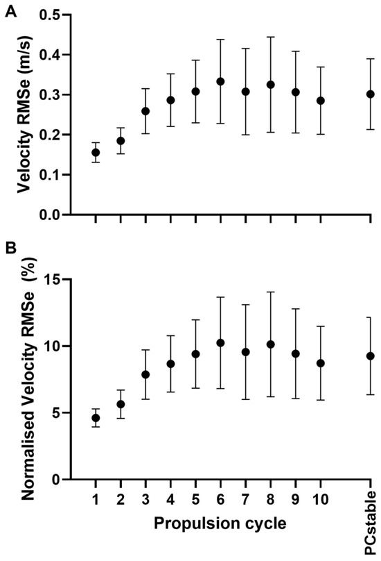 (A) Absolute velocity RMS error (RMSe); (B) velocity RMS error normalized to the maximal velocity over the ten first propulsion cycles. PCstable: propulsion cycles 3 to 10.