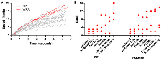 (A): Wheelchair velocity curves of all NPs (gray) and WRAs (red). (B): Ranks of the WRAs within the entire group (for a total of 16 participants: 3 WRAs + 13 NPs).