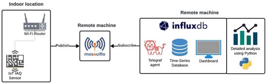 - Hapsari, A.A.; Hapsari, A.A.; Hajamydeen, A.I.; Hajamydeen, A.I.; Vresdian, D.J.; Vresdian, D.J.; Manfaluthy, M.; Manfaluthy, M.; Prameswono, L.; Prameswono, L.; et al. Real Time Indoor Air Quality Monitoring System Based on IoT using MQTT and Wireless Sensor Network. In Proceedings of the 2019 IEEE 6th International Conference on Engineering Technologies and Applied Sciences (ICETAS), Kuala Lumpur, Malaysia, 20–21 December 2019. [Google Scholar] [CrossRef]