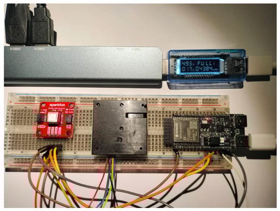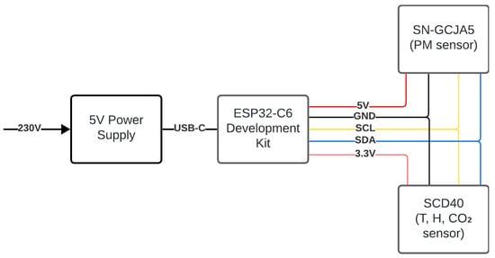 As described in Section 3, a ESP32-C6 microcontroller is equipped with two sensors: SN-GCJA5 and SCD40. The sensors are connected to the microcontroller I2C bus and supplied with electrical power (3.3 V for SCD40 and 5 V to SN-GCJA5). The ESP32-C6 development kit board has 3.3 V and 5 V output and is connected to a conventional USB power source (5 V). The complete setup can be observed in Figure 3.