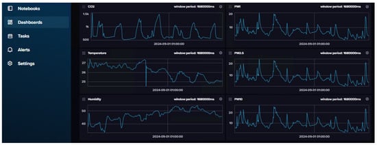 After connecting to InfluxDB using Python, the Flux query language specifies how data are to be retrieved from a bucket. To achieve this, the written query filters data by a specific topic (sensor/data) and field (CO2, temperature, humidity, PMx, etc.). Furthermore, the start and stop variables are manually configured, which defines the time range of the data query. Data are aggregated into 30 min intervals using the aggregateWindow function, obtaining a mean value of the measurements for each interval. This allows the query to run faster for visualization, but raw values can be obtained if necessary (for example, for statistical analysis). A query can be observed in Listing 2, and is sufficiently flexible to accept different bucket names and start/stop dates using F strings. After running the Flux query, the returned data are processed by being converted into a Pandas data frame to enable further manipulation as implied in lines 16–18 of Algorithm 4. Finally, Matplotlib is utilized to plot each parameter level over the specified period, providing clear visuals of how measurements fluctuate over time as described in lines 19–27.