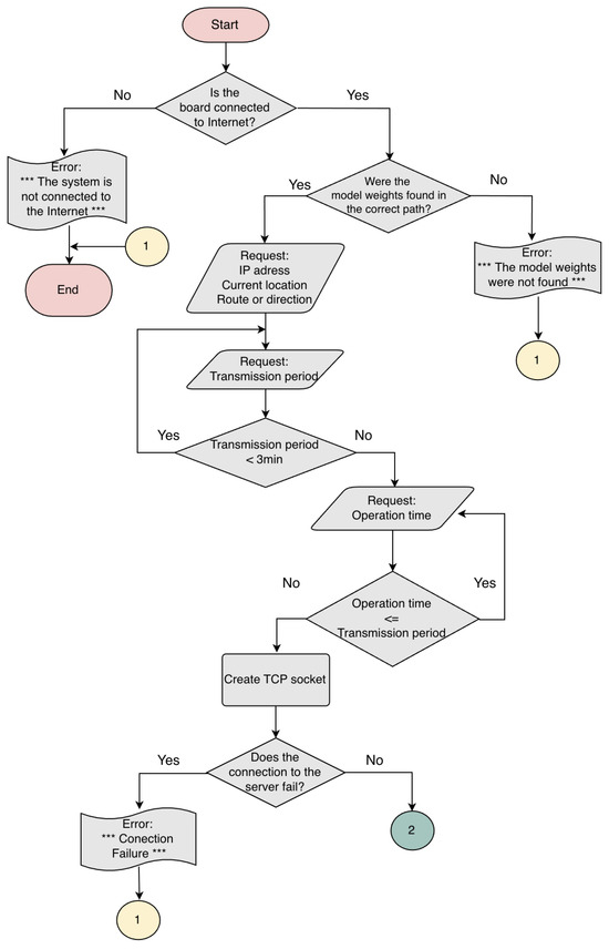 The image processing and control subsystems need sufficient input/output interfaces to manage all the subsystems, an operating system for hardware management, and high computing capacity for the hardware implementation of the CSRNet model. The Jetson Nano development board [22] was selected for this task. The image processing and control subsystem flowchart is shown in Figure 3 and Figure 4. The data transmission period is greater than the inference time and less than 30 min, and the operation time is established as 18 h.