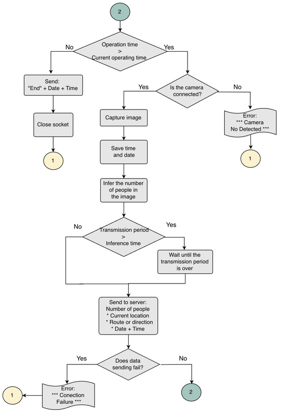 - Image processing and control subsystem. It is responsible for establishing the connection with the server, managing the image capture, starting the inference, and sending the data to the server periodically. This module is responsible for finishing the execution program and generating the error logs if any processes fail. Its functions are to manage the user interface and the image acquisition subsystem, run the CSRNet algorithm in inference mode to obtain the number of passengers from the image, generate and send information in each inference (number of people, place, date, and time), and record errors produced in any subsystem.