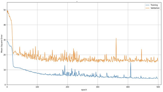 The hyperparameter values of the models used in the training process are detailed in Table 3. Stochastic gradient descent (SGD) was used as an optimizer with a learning rate of . The number of epochs was set to 500. The batch size was 1 because an increase in this negatively impacts the performance of the model.