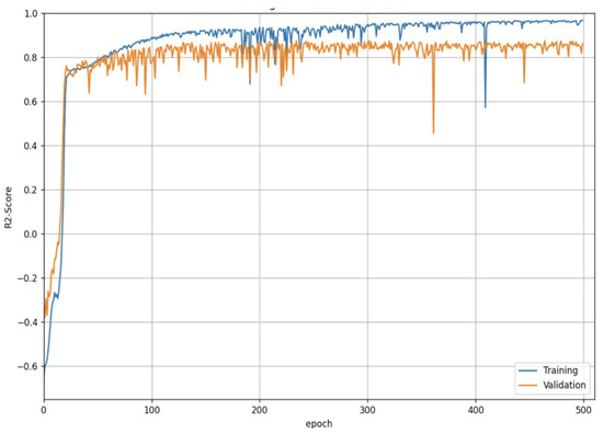 R2-score curves on training and validation process or the CSRNet A model with the MXPublicTransport dataset.