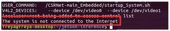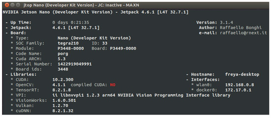 For the inference, the jetson-inference container was cloned [26], which has PyTorch pre-installed in a Python3 environment. The Docker container is 1.2 GB in size. Considering that the minimum size recommended by NVIDIA for the microSD card is 32 GB, the embedded software would only occupy less than 10% of the memory capacity. Table 5 presents the technical characteristics of the Jetson Nano developer board.