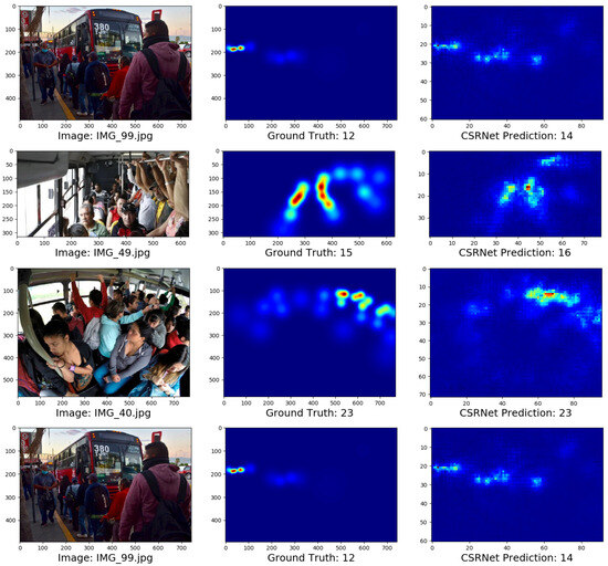 Comparisons between the density maps and the prediction results of the hardware implementation of some images are described in Figure 12. The images show that the prediction results are very close to the ground truth values. These results reveal that our model performs well and can be used in an embedded module as a passenger counting system.