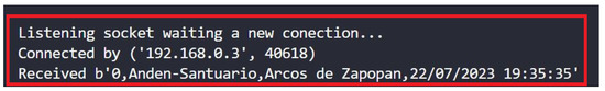 - Location. The place where the image was taken. The message can be in two different formats. When the image is taken in a station, the message contains information about the station. When the images are taken inside a vehicle, the message contains information about the wagon/vehicle number and departure station. Figure 14 has an example of the received message by the server.