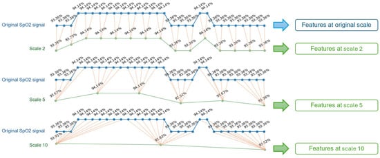 The original SpO2 signals in the SHHS dataset are sampled at 1 Hz. The multi-scale feature engineering process, inspired by existing studies [24,33], begins with coarse-graining the signals at various timescales, ranging from 2 to 10 s with an increment of 1 s, from 15 to 60 s with an increment of 5 s, and from 120 to 600 s with an increment of 60 s. This allows us to examine the predictive power of features at a wide range of timescales. Multiple coarse-grained timescales are constructed by averaging the data points within non-overlapping windows of increasing length. The coarse-graining process is illustrated in Figure 1.
