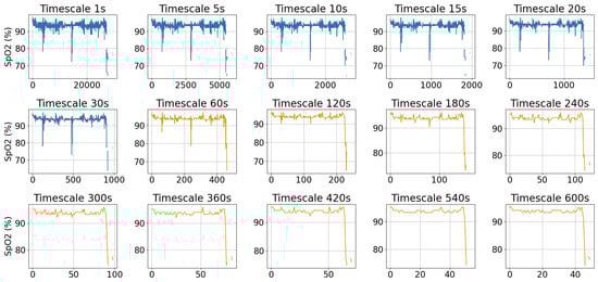 Figure 2 shows an example of a SpO2 signal at its original sampling rate and after coarse-graining at various timescales, ranging from 5 s to 600 s. As the timescale increases, the signal becomes smoother, and large fluctuations are filtered out, leading to a reduction in complexity. The orange plots in Figure 2 illustrate the low-resolution data typically accessible from consumer smartwatches such as Fitbit. It is observed that at a timescale of 60 s, the signal is noticeably smoother while still retaining key fluctuations.