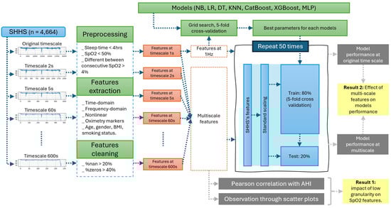 We apply multiple machine learning algorithms including naïve Bayes (NB), Logistic Regression (LR), decision tree (DT), K-nearest neighbor (KNN), CatBoost, XGBoost (XGB), and a basic multilayer perceptron (MLP). These algorithms are chosen for their simplicity and interpretability, which makes them well suited for understanding feature importance. Hyperparameter tuning is achieved through grid search with 5-fold cross-validation. A baseline single-scale model is developed using features extracted from the original 1 Hz SpO2 signal. Model performance is evaluated using several metrics, including accuracy (Acc), precision (Pre), sensitivity (Sen), F1-score, Matthews correlation coefficient (MCC), and area under curve (AUC). To gain a statistical perspective of the model performance, the training and test process is repeated 50 times, each time using a different random seed for data splitting. This approach helps minimize the risk that the model performance is influenced by a specific train–test split and confirms that the observed behavioral patterns of multi-scale features are consistent across experiments rather than being due to random variation. The results are reported as the mean and standard deviation in Section 3.