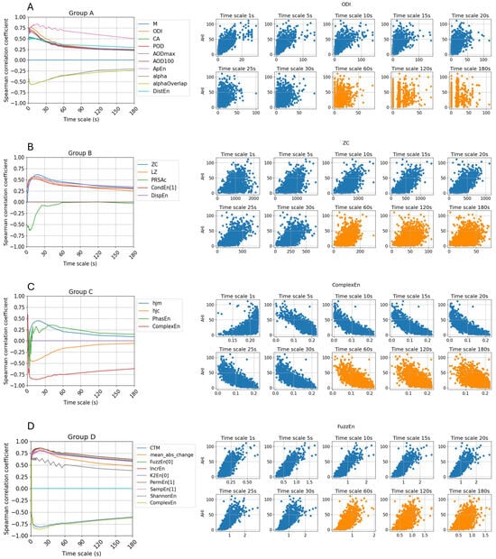 In this group, the approximate entropy demonstrates a more stable relationship with AHI compared to other features, with a median correlation of 0.72 and maintaining a correlation above 0.5 even at a timescale of 120 s (equivalent to a sampling frequency of one sample per two minutes). However, as the timescale increases further, its correlation declines to nearly zero. In contrast, the oxygen desaturation index (ODI), despite having the highest correlation at 1 s and being widely used in sleep apnea detection, exhibits a sharp decline as the timescale increases. As observed in the scatter plot in Figure 4A, the feature values become segmented, with a growing proportion of zero values, indicating that desaturation events are harder to detect when the SpO2 signals are coarsely grained at longer timescales.