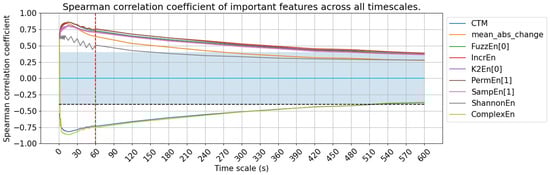 Another important finding in this study is that the nine features exhibit high correlation with AHI and maintain a moderate relationship ( ≥ 0.5) even at the 60 s timescale. These include two statistical features (central tendency measure and average magnitude of change of SpO2) and seven non-linear features (Fuzzy entropy, increment entropy, Kolmogorov entropy, permutation entropy, sample entropy, Shannon entropy, and complex entropy). Notably, non-linear features, such as complex entropy, maintain a strong correlation with the AHI even at timescales as long as 600 s, making them well suited for low-resolution data environments like wearable device applications. This finding is consistent with published studies that reported non-linear features as important sleep apnea indicators. These include entropy measures like approximate entropy (ApEn) [14,39], sample entropy [20], attention entropy [24], and spectral entropy [23], which capture signal complexity and variability. This finding helps us answer RQ2.