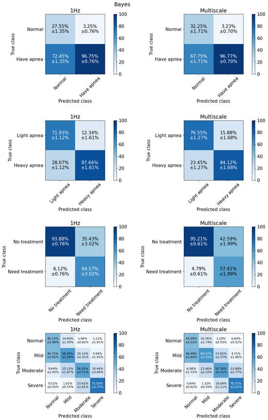 For cut-off ≥ 5 events/h, subjects were categorized into two groups: healthy individuals and those with sleep apnea, labeled as “normal” and “have apnea”, respectively. We observed that classifiers at this cut-off often result in the highest degree of bias among the models used in this study. The poorest performance is observed in the first row of Figure 6, where the Bayes model exhibits a strong bias toward the majority class (patients).