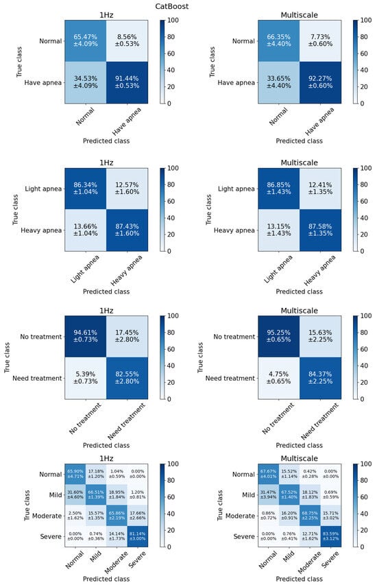 The observed increase in MCC, particularly at the AHI cut-off of 5, suggests that multi-scale feature engineering improves class separation. Specifically, as shown in the first row of confusion matrix in Figure 6, this approach increases the percentage of true positives while reducing false positives. In the case of CatBoost as shown in Figure 7, false negatives are also slightly decreased.