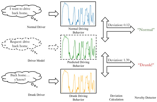 To achieve this, normal driving behavior data from various scenarios are utilized to train a driver model capable of predicting the ideal driving behavior based on the driver’s observed behavior in any given scenario. The deviation between the observed and ideal behaviors is quantified using the L1 distance, and this deviation is subsequently fed into a novelty detector to determine whether the driver is operating in a normal state. Finally, the detection results from various segments of a journey are aggregated to produce a final determination of whether the driver was drunk during the journey.