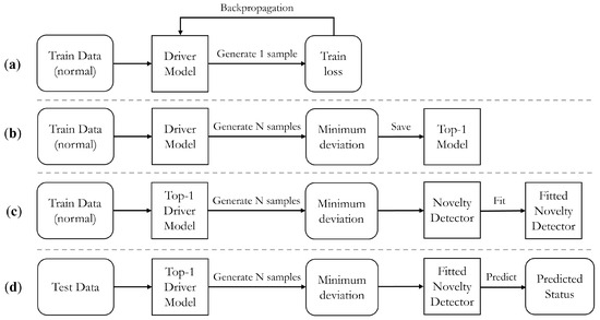 Illustration of the implement process of DUIncoder: (a) training process of the driver model; (b) validating process of the driver model; (c) fitting process of the novelty detector; (d) inferring process of DUIncoder.