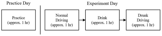 As shown in Figure 7, all participants first underwent approximately one hour of pre-experiment practice to familiarize themselves with the simulator. On the experiment day, an initial hour was devoted to collecting normal driving data, during which each instance of driving on every route was saved as a separate driving record. This was followed by an approximately one-hour interval for drinking, during which participants consumed 2–3 units of sake according to their body weight to achieve a BAC level of 0.40 mL/L in breath [2]. Following alcohol consumption, participants ingested a small amount of water and waited for 10 min to mitigate residual alcohol effects in the oral cavity that might influence the results. Measurements were taken at the beginning and end of the drinking phase to ensure achieving the desired BAC level. Finally, there was approximately one hour allocated for the drunk driving, during which the driving scenario replicates that of the preceding normal driving.