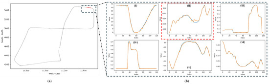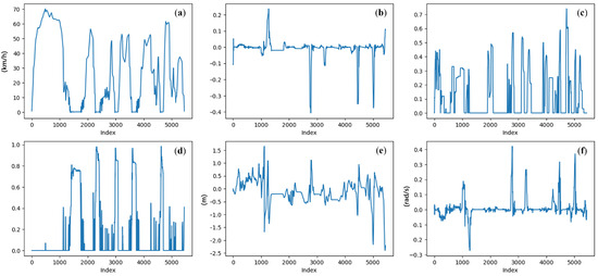 Example of driving behaviors during a journey: (a) vehicle velocity (km/h); (b) steering angle ([−1, 1]); (c) throttle position ([0, 1]); (d) brake position ([0, 1]); (e) lane center deviation (m); (f) yaw rotation speed (rad/s).