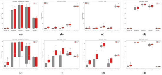 The three routes, as illustrated in Figure 6, are designated as “near accident urban” (hereafter referred to as “accident”), “urban” and “highway”. Route “accident” simulates a typical Japanese urban roadway, incorporating potential accident scenarios such as sudden lane changes by vehicles in adjacent lanes, pedestrians intruding onto the roadway, and vehicles emerging from blind spots. Route “urban” represents a similar environment to Route “accident” but with a more stable traffic flow. It primarily involves scenarios like car following within urban roads. In contrast, Route “highway” depicts a Japanese highway, which is characterized by lower traffic density and higher speeds compared to Routes “accident” and “urban”.