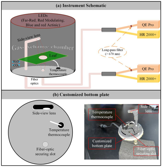 To minimize such errors, Meeker et al. [26] employed the Multiphase FlashTM Fluorometer (LI-COR Inc., Lincoln, NE, USA), an integrated system combining a gas exchange measurement setup, PAM fluorometer, and incident light source, as a replacement for the transparent chamber. By modifying the bottom chamber plate of the Multiphase FlashTM Fluorometer, they enabled the measurement of passively induced chlorophyll fluorescence spectra from the abaxial side of the leaf, in addition to conducting gas exchange and PAM parameter measurements. While these studies successfully achieved simultaneous observations of actively and passively induced chlorophyll fluorescence along with gas exchange, they were limited to chlorophyll fluorescence measurements from a single side of the leaf, which hinders the estimation of fluorescence at the photosystem scale [27,28].