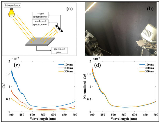 Before applying the system, radiometric calibration of the optical paths in the four spectrometers was performed using the cross-calibration method described by Yang et al. [29]. This method employs a pre-calibrated spectrometer as a reference to calibrate other spectrometers. In this study, a halogen lamp (Lowel Pro-light; Lowel-Light Manufacturing Inc., New York, NY, USA; 350–2500 nm, 250 W, 230/240 V AC~) was employed as the light source, and reflected radiance from a standard reflectance panel (Jingyi Optoelectronics Technology, Guangzhou, GD, China; ~2% reflectance) was measured simultaneously using a pre-calibrated spectrometer (QE Pro; Ocean Optics Inc., Dunedin, FL, USA) and the target spectrometers, which required calibration (Figure 2a,b). The calibration factor (Cal) was subsequently derived as follows: