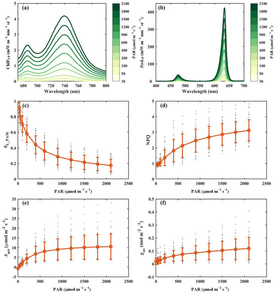 Representative results from light response curve measurements. (a) Upward chlorophyll fluorescence (ChlFUP, mW m−2 nm−1 sr−1). (b) Reflected radiance (RadUP, mW m−2 nm−1 sr−1). (c) Fraction of open PSII reaction centers derived from PAM parameters (qL_PAM). (d) Non-photochemical quenching derived from PAM parameters (NPQ). (e) Net photosynthesis (Anet, μmol m−2 s−1). (f) Stomatal conductance (gsw, mol m−2 s−1). In panels (c–f), the red circles and error bars represent the mean values and corresponding standard deviations of 52 species, respectively, while the gray dots indicate the measurements for individual species.